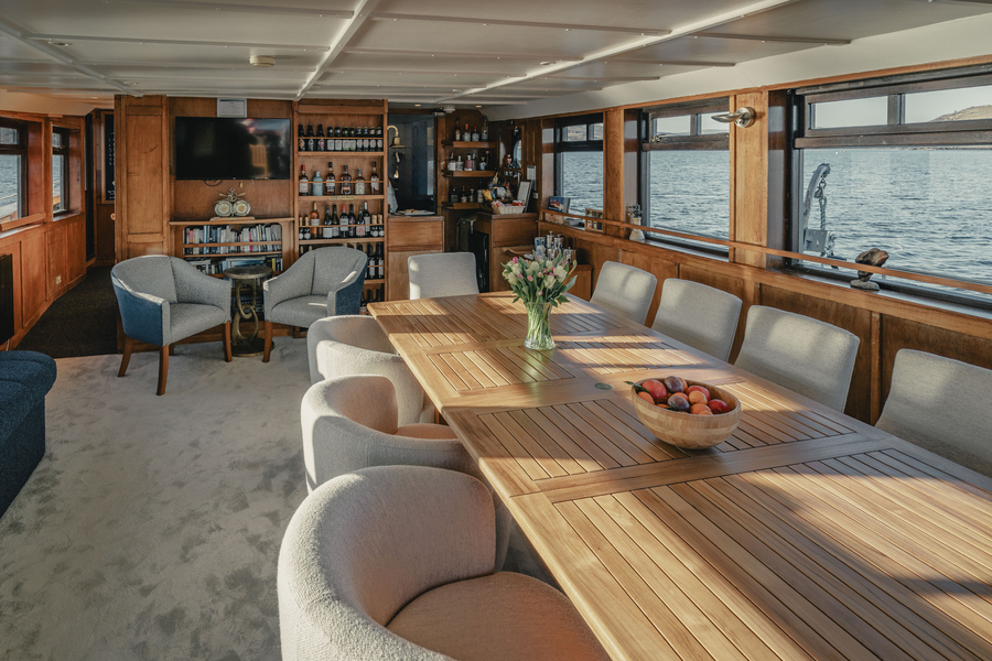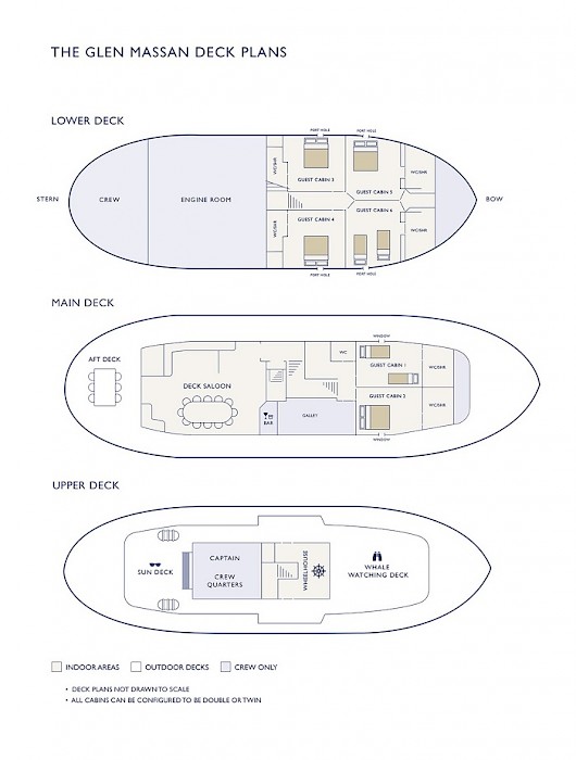 Transformed into a bespoke cruise ship, Glen Massan can accommodate 11 guests in 6 double/twin ensuite cabins. There are two cabins on the main deck and four cabins below deck.